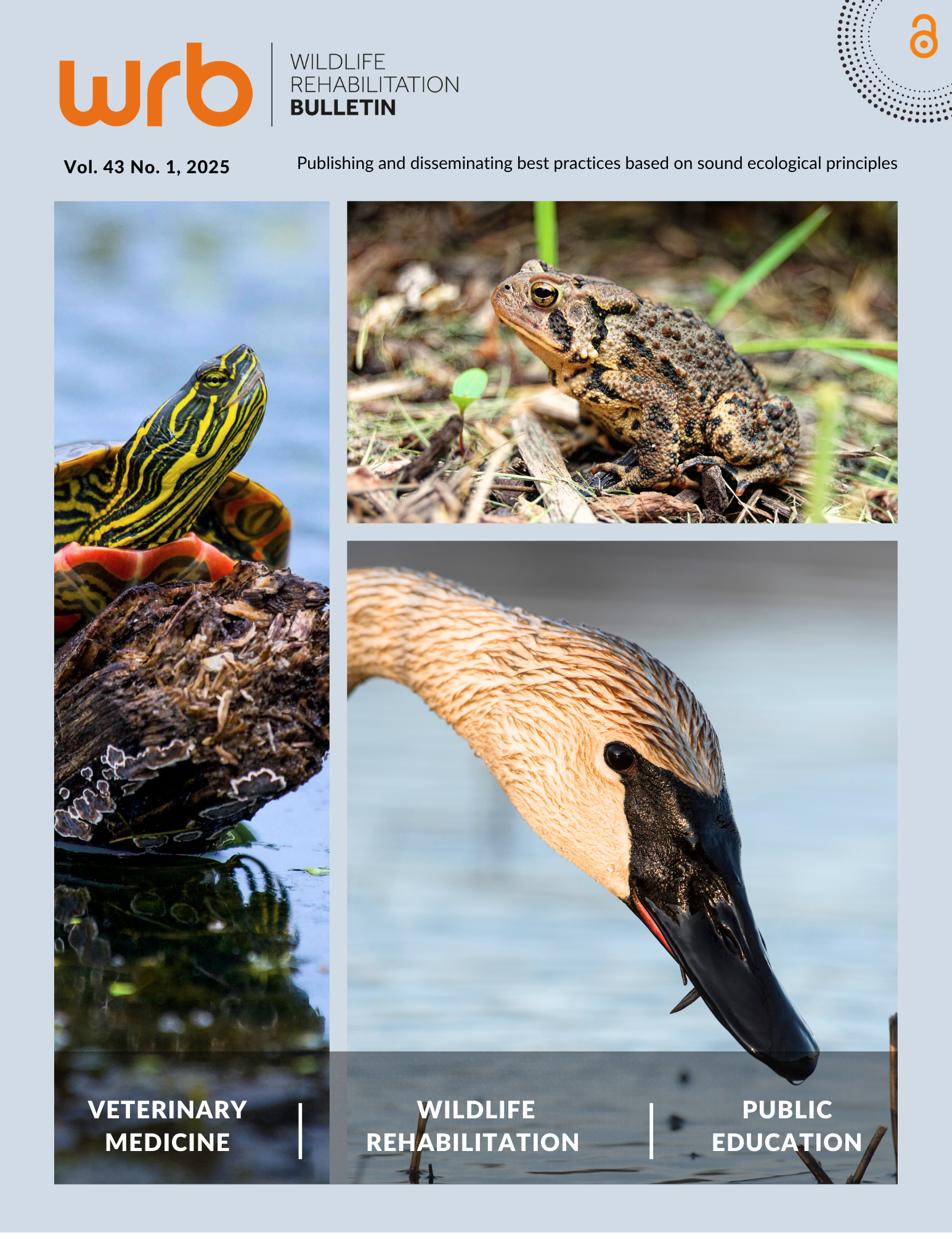 The copyright for articles in this journal is retained by the author(s), with first publication rights granted to the Wildlife Rehabilitation Bulletin and NWRA. Articles published as open-access in this journal are free to use and share with proper attribution in educational and other non-commercial purposes. To obtain reprint permission for articles that are not open access, please contact the journal editor.